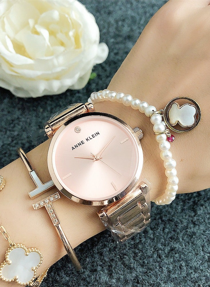 ساعة آن كلاين النسائية الدائرية كوارتز باللون الذهبي الوردي مع حزام من الفولاذ المقاوم للصدأ باللون الذهبي الوردي