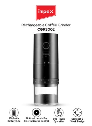 مطحنة قهوة قابلة لإعادة الشحن | مطحنة قهوة كهربائية محمولة مع 38 مستوى طحن | بطارية 1500 مللي أمبير، تشغيل بلمسة واحدة | للإسبريسو، الضغط الفرنسي، التخمير البارد، الأعشاب، إلخ | مثالية للسفر، التخييم، المكتب، إلخ | CGR3002