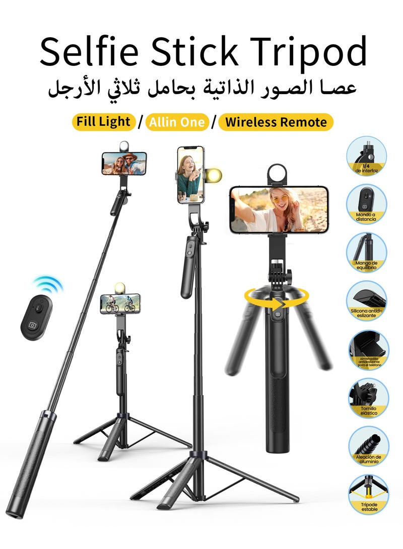 عصا سيلفي طويلة مع حامل ثلاثي القوائم من الألومنيوم، بطول 71 بوصة/180 سم، تدور 360 درجة، مناسبة للهواتف، مع جهاز تحكم عن بُعد قابل لإعادة الشحن وإضاءة LED، وبرغي 1/4 بوصة لكاميرات GoPro وتسجيلات الفيديو