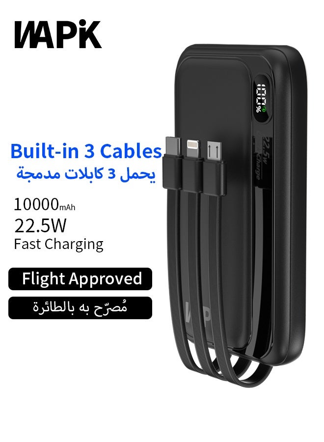 ماركة كورية M1 باور بانك 10000 مللي أمبير 22.5 واط شحن سريع مع كابلات مدمجة لايتنينغ Type-C مايكرو USB، شاشة رقمية، منافذ USB-A و Type-C، متوافق مع آيفون سامسونج هواوي – أسود
