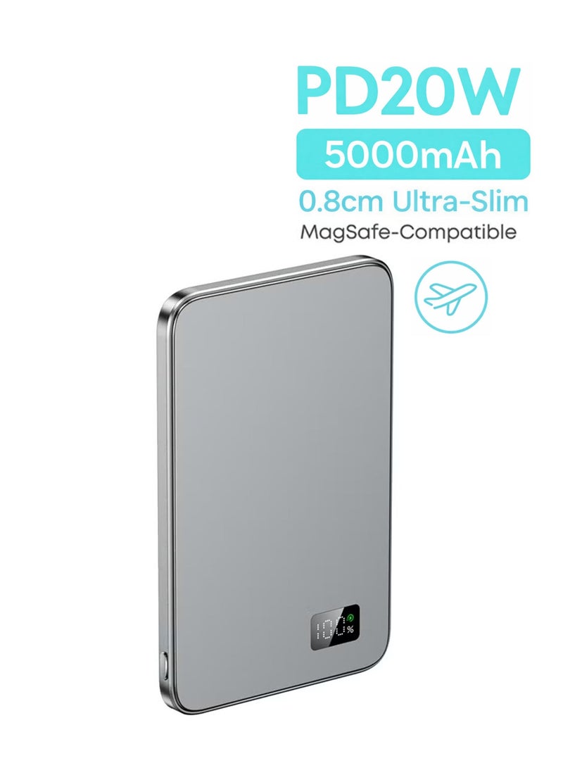 بنك طاقة لاسلكي مغناطيسي فائق النحافة مزود بشاشة LCD وسعة 5000 مللي أمبير، يدعم الشحن السريع PD، مزود بمنفذ USB-C، متوافق مع MagSafe، متوافق مع سلسلة هواتف iPhone 17/16/15/14/13/12