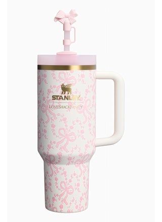 كوب Stanley Love Shack Fancy H2.0 Flow State سعة 40 أونصة وردي جميل، معزول بالفراغ من الفولاذ المقاوم للصدأ مع غطاء وقشة وسدادة في عبوة أنيقة جاهزة للهدايا، يحافظ على برودة المشروبات لساعات