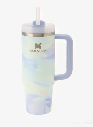 كوب ستانلي كوينشر H20 فلوستيت معزول بتفريغ الهواء من الفولاذ المقاوم للصدأ، سعة 40 أونصة، مع غطاء وقشة، مناسب للمياه والشاي المثلج أو القهوة والعصائر وغيرها، بلون كريمي (نقشة نمر)