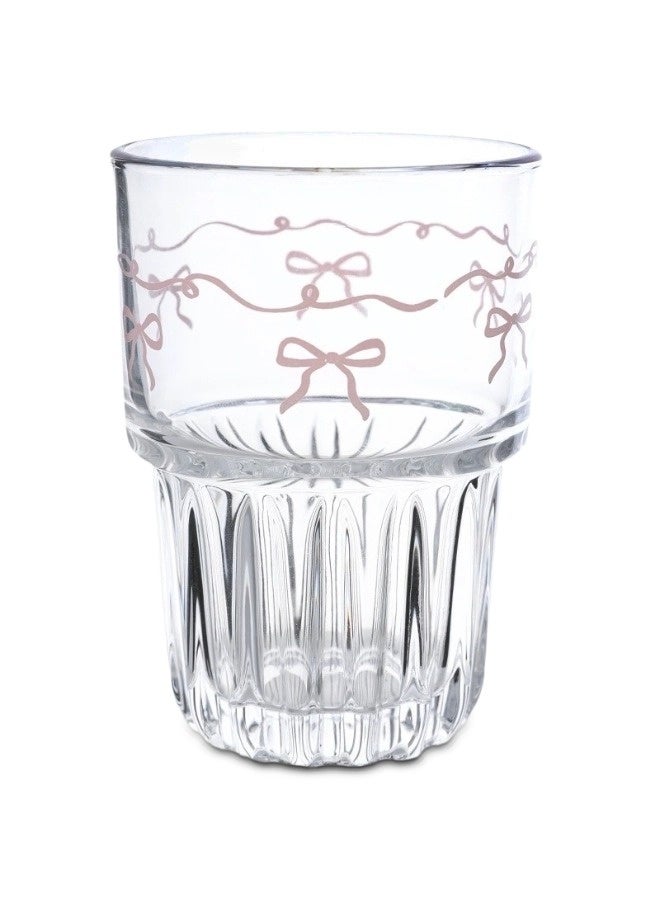 كوب زجاجي أنيق بسعة 380 مل مع نقش فيونكة لطيفة – تصميم مبتكر قابل للتكديس، مثالي لعصير الفواكه أو القهوة الباردة أو الحليب أو الشاي أو الحلوى
