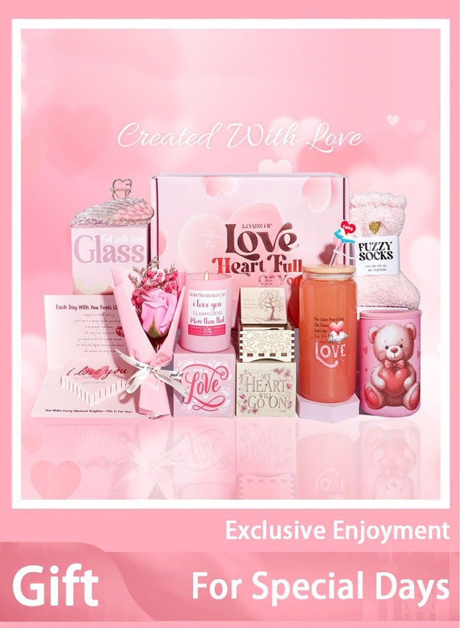 Gifts Set for her,Love Theme Care Package with 3D Card, Bear Cup Sleeve, Music Box, Rose Gold Hair Clip, Velvet Candle - Unique Birthday Gifts for Her Women Girlfriend