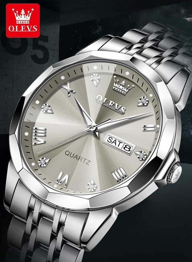 Business Quartz Watch for Men Dual Calendar Luxury Diamond Dial Waterproof Stainless Steel Strap Men Wristwatch