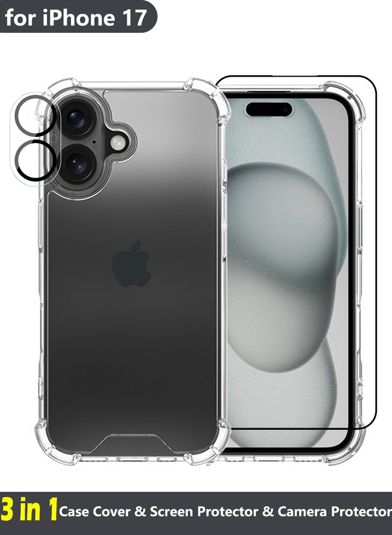 3 in 1 iPhone 17 Protection Pack, Clear Case with Screen Protector&Camera Lens, Transparent Slim Fit Anti-Scratch Soft TPU Edge Hard PC Back Cover with Airbag Corners, Clear