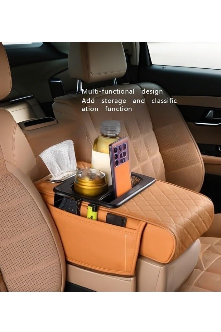 وسادة مسند ذراع للسيارة، غطاء كونسول وسطي 5 في 1 مع 2 كيس تخزين حامل أكواب، فتحة علبة مناديل، فتحة هاتف لسيارات السيدان، منظمات داخلية لإكسسوارات السيارات (برتقالي)