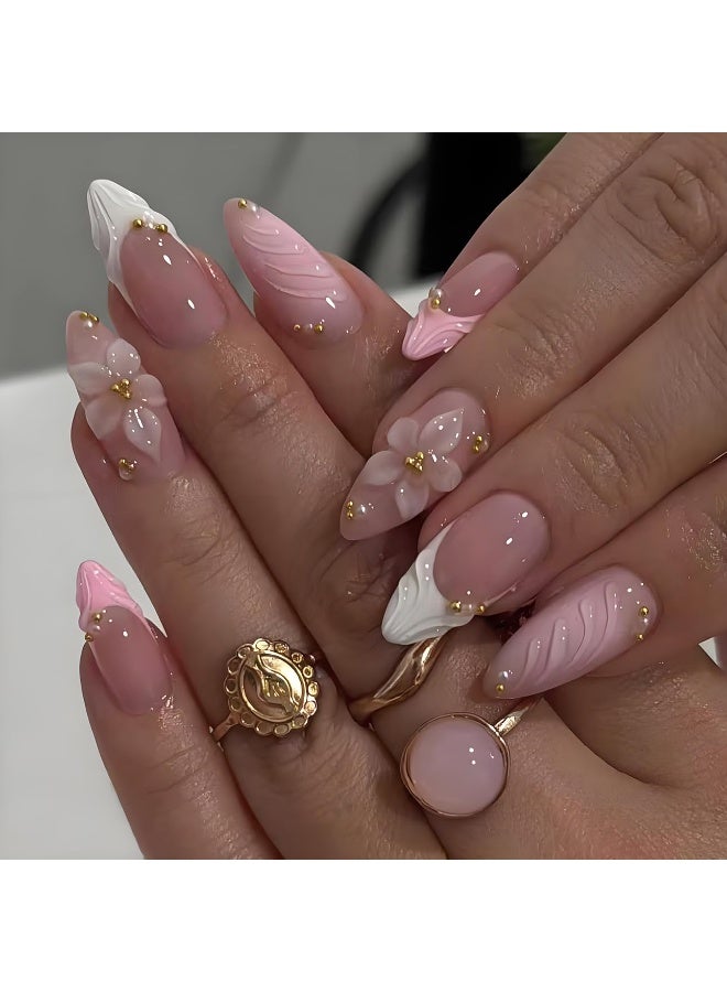 3D الوردي الصحافة على الأظافر اللوز - متوسطة نصيحة فرنسية الأظافر الزائفة مع تنقين الزهور والذهب تصميمات الخرز، لامعة الانتهاء قابلة لإعادة الاستخدام الأظافر الزائفة مع علامات التبويب الغراء - 24pcs أظافر مجموعة للمرأة مانيكير