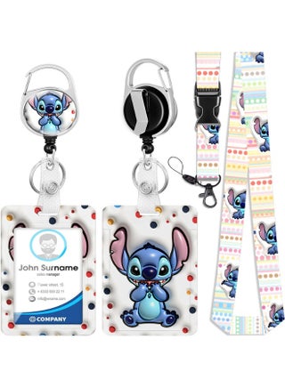حامل بطاقة هوية بلاستيكي أبيض من الجيلاتين بنمط ديزني ستيتش وكرات ملونة 3 في 1 مع حبل قابل للسحب، وبكرة شارة، وسلسلة مفاتيح، ووصلة تمديد - مناسب للعمل، والطلاب، والحافلات، والأطباء، والممرضين