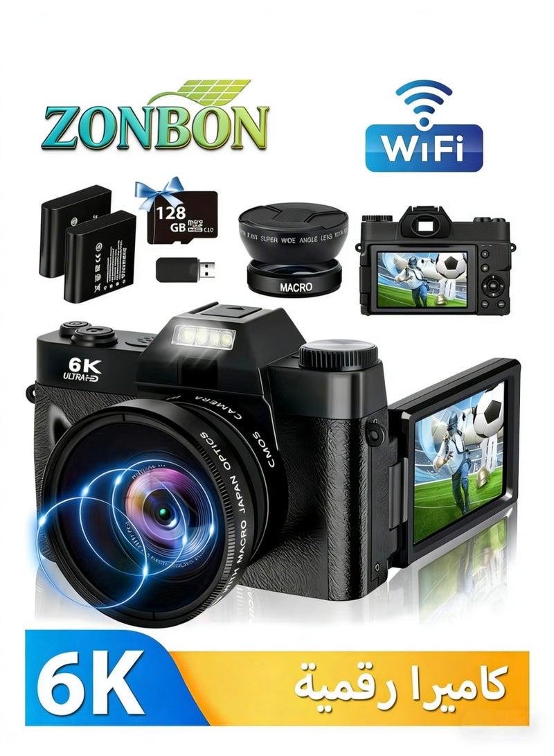 كاميرا رقمية 6K للتصوير - كاميرات رقمية مع بطاقة TF سعة 128 جيجابايت، وكاميرات فيديو مدونات واي فاي بدقة 64 ميجابكسل لليوتيوب مع شاشة قلابة 3 بوصات بزاوية 180 درجة، وكاميرا سفر مدونات فيديو بتركيز تلقائي 16X، وعدسة واسعة الزاوية وعدسة ماكرو، وبطاريتان
