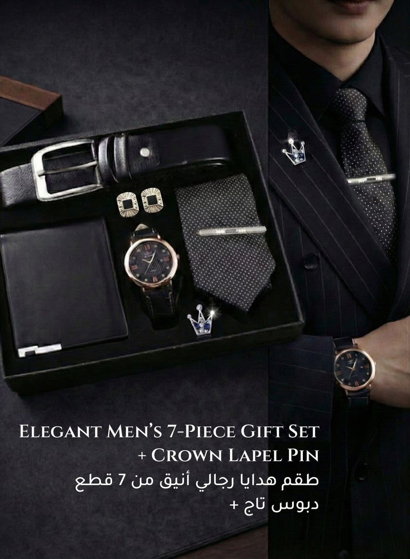 طقم هدايا رجالي فاخر 7 قطع - ساعة يد، محفظة، حزام جلد، كرفتة، أزرار أكمام ومشبك كرفتة - أفضل هدية فخمة للرجال