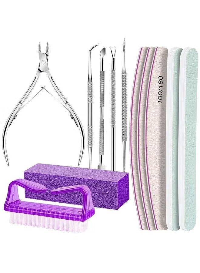 12 PCS Nail Files And Buffer Block Set, Cuticle Nippers with 100/180 Emery Boards Nail Buffer Kit, Pusher Toenail Lifter Peeler Scraper Nail Brush, For Manicure And Pedicure Tools (Purple)